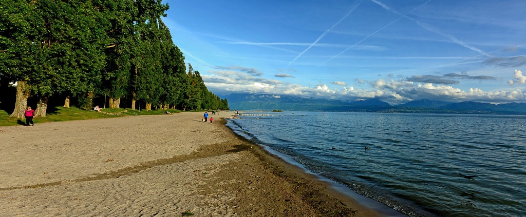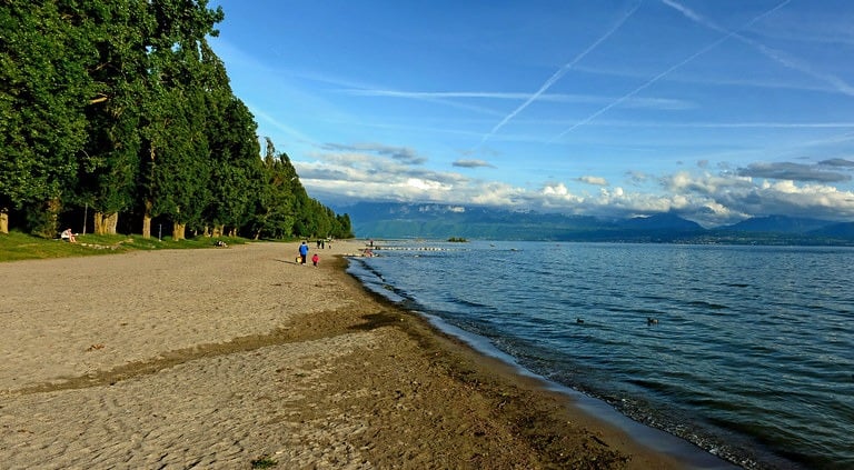 Although a bit further from Geneva, Plage de Préverenges is a popular choice for those seeking a quiet and well-maintained beach. Located in the municipality of Préverenges, about a 45-minute drive from Geneva, this beach features a wide expanse of sand, shallow waters ideal for swimming, and a variety of facilities including beach volleyball courts, playgrounds for children, and restaurants. Moreover, the natural surroundings of forests and mountains make it a picturesque place to spend the day.